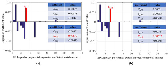 The topological deviation map of the tooth flank obtained by the structured light measurement is shown in Figure 8. Figure 8a shows the topological deviation of the left tooth flank, and Figure 8b shows that of the right tooth flank. The deviation is characterized by the method proposed in this paper to obtain various expansion coefficients. In this experiment, the 6th-order Legendre polynomial is used to characterize the deviation, and a total of 36 polynomial expansion coefficients are obtained. The specific values are shown in Figure 9. In Figure 9a, the expansion coefficient characterizing the twist of the left tooth flank is 0.00679, and the twist deviation can be calculated as 81.4 according to Equation (13). In Figure 9b, the expansion coefficient characterizing the twist of the left tooth flank is 0.00637. Similarly, the twist deviation can be calculated as 76.4 .