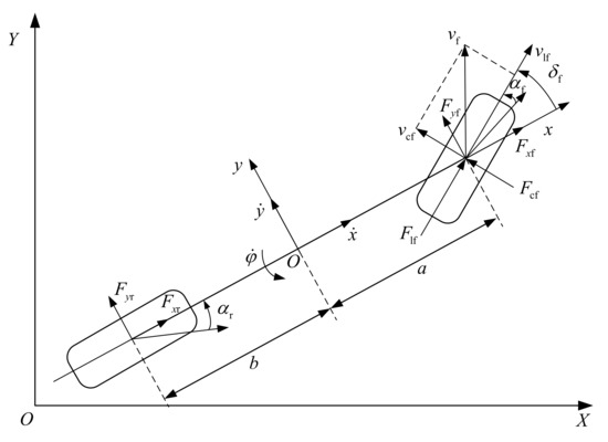 In this paper, a three degree of freedom (3DOF) nonlinear vehicle dynamics model is established [23], as shown in Figure 1.