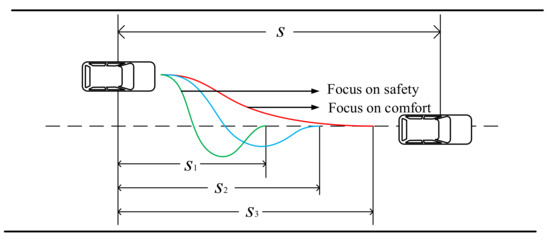 Moreover, the preceding vehicle is also an important factor affecting the lane keeping control of commercial vehicles. Compared with passenger cars, due to the characteristics of a larger load and higher center of mass and longer wheelbase, commercial vehicles have longer adjustment time and distance during the process of lane keeping [20]. If the relative distance between the vehicle and the preceding vehicle is long and the relative speed is low, the driving condition of the vehicle is relatively safe, and the lane can be dynamically tracked and controlled smoothly. If the relative distance of two vehicles is short and the relative speed is fast, the vehicle needs to return to the lane centerline as soon as possible, so as to avoid the risk that the course of the vehicle cannot be adjusted immediately or even deviate from the lane during deceleration and collision avoidance [21,22]. Therefore, the relative distance, relative speed between the vehicle and the preceding vehicle and other state parameters will affect the safety and comfort in the process of lane keeping. Consequently, it is necessary to take the state of the preceding vehicle as the constraint for dynamic lane tracking control. However, the existing research does not consider the impact of external factors, including the state of preceding vehicle on dynamic lane tracking control, and the application scenario is relatively simple.