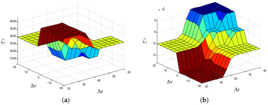 (a) When the relative distance between the vehicle and the preceding vehicle is very small, the driving condition is dangerous. The elements of ζ1 ζ2 in the variable weight coefficient matrix are increased according to the relative speed . In other words, if the fuzzy universe of changes from NB to PB, ζ1 ζ2 change from PB to PM, correspondingly.