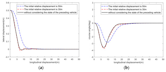 From the figures, when the initial relative distance between two vehicles is set as 30 m, the response speed of the RMPC controller considering the state of preceding vehicle is 6.8% faster than that without considering the preceding vehicle state, while when the initial relative distance is set as 50 m, the response speed of the RMPC controller considering the state of preceding vehicle is 57.2% slower than that without considering the preceding vehicle state. Compared with 50 km/h, the lane tracking error, course angle, and yaw rate at 80 km/h is larger so that a slight steering wheel angle can bring about a larger state change in the vehicle at high speed. However, the vehicle is still in the safe state.