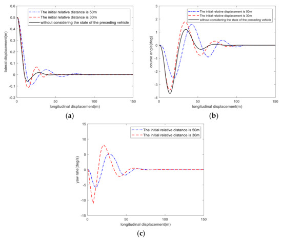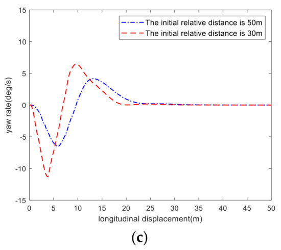 From Figure 5a, it can be observed that when the initial relative distance is 30 m, the response time of the vehicle for lane tracking is the shortest, and the response speed is 7.8% faster than that of the RMPC controller, without considering the state of the preceding vehicle. However, in Figure 5c, its yaw rate is larger, which indicates that when the distance between two vehicles is small, the primary goal of the vehicle is to complete lane tracking as soon as possible to ensure safety. In this case, the vehicle has better lane tracking performance, faster response speed and poor comfort. When the initial relative distance between the two vehicles is set as 50 m, Figure 5a shows that the response time of the vehicle for lane tracking is longer, and the response speed of the RMPC controller considering the preceding vehicle state is 59.4% lower than that of the RMPC controller without considering the preceding vehicle state. In this case, as shown in Figure 5c, the yaw rate is still small, which indicates that when the local vehicle is far from the preceding vehicle, the primary goal of lane tracking control is to ensure both comfort and safety. In this situation, the comfort of the vehicle is higher, and the lane tracking performance and accuracy are slightly worse.