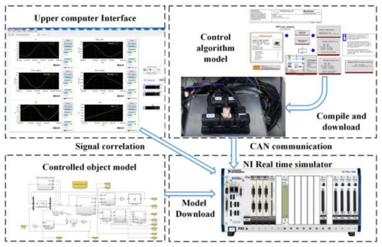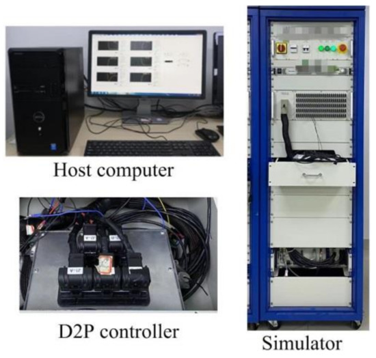 In order to verify the effectiveness of the dynamic lane tracking control algorithm in the real controller, the HiL (hardware-in-the-loop) test was carried out. The HiL test platform is shown in Figure 7, including the host computer, the simulator and D2P controller. The software system of the HiL test platform mainly includes the controlled object model, control algorithm and host computer system configuration. The controlled object model is compiled in MATLAB and transferred to the simulator by the host computer software. The control algorithm is compiled and downloaded to the D2P controller. The digital signal output from the controlled object model in the simulator is transferred to the D2P controller. Under the calculation and processing of the control algorithm, the control signal is transmitted to the controlled object model through the communication card, which forms a closed-loop control. The overall test block diagram is shown in Figure 8.