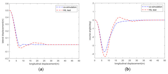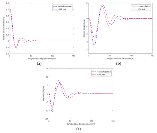 Figure 10 shows the comparisons of co-simulation and HiL test results at the speed of 80 km/h. It can be observed from Figure 10a that the maximum path tracking error of the HiL test and co-simulation is always within an acceptable range of 0.04 m at high speed. From Figure 10b,c, it can be observed that the trend of course angle and yaw rate of the HiL test is basically consistent with that of the co-simulation, which indicates that the control strategy designed in this paper has a good control effect under high speed conditions.