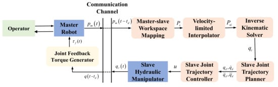 Compared with fully autonomous operation, the more reliable way to complete tasks especially in harsh working conditions such as subsea or nuclear reactor treatment sites by using manipulators is bilateral teleoperation, which has attracted the attention of relevant scholars. Bilateral teleoperation is an operation method in which the operator sends operating commands on the master side (command side) and controls the slave side (execution side) equipment to complete actual task. Nowadays, the research on bilateral teleoperation mainly focuses on the following aspects. Firstly, since the operator cannot feel the feedback of the operation in the actual occasion during the teleoperation process, it is necessary to design the operation sensing and feedback method of the end-effector of the slave robot. To address this issue, Mauricio et al. built an environment-based 3D model to estimate the repulsive force delivered to the operator to provide haptic feedback during operation [4]. Carlos et al. used Gaussian mixture model for gesture recognition based on the learning from demonstration (LfD) method to guide the operator to complete the teleoperation task [5]. In addition, since the operation commands is sent from the master side to the slave side, there will inevitably be time delay, so it is very important to design a new communication channel to ensure the authenticity of the signal and the stability of the whole closed-loop system under the time delay. For this consideration, Pan et al. proposed a time-domain passive method to ensure the stability of teleoperating systems under time delay [6], and Huang et al. introduced an adaptive control scheme for nonlinear bilateral teleoperation manipulators [7,8]. However, the experimental devices involved in the above teleoperation fields are usually electric-driven actuators, and the research on teleoperation of hydraulic manipulators is very limited [9].