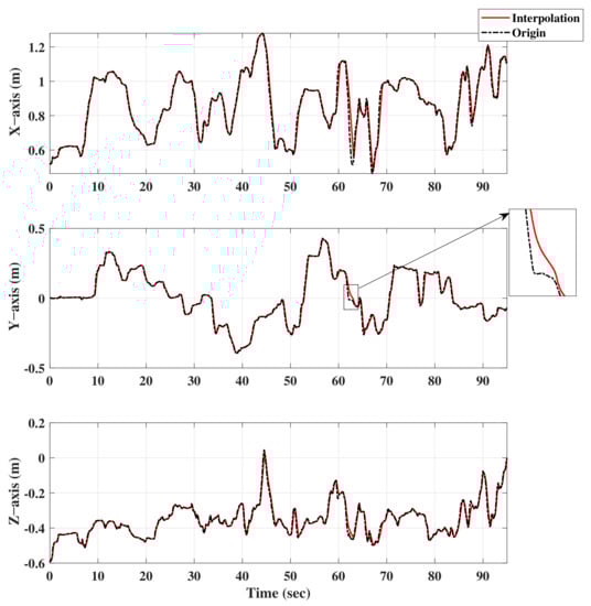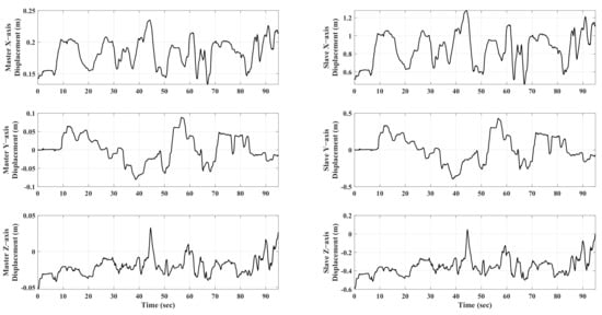 In terms of the moving trend of the mapping result, it can be seen from Figure 3 that the trend of the end-position control target trajectory of the master robot and the slave manipulator in the Cartesian coordinate system is similar. In terms of workspace utilization, the maximum motion range of the main end manipulator was (cm) during the whole experiment, and the maximum motion range of the slave end manipulator was (cm). These data show that, when the master manipulator controlled by the operator moves to the maximum extent in the allowable workspace, which is shown in Table 1 (the workspace utilization rate is ), the slave manipulator can also make the maximum use of its workspace (workspace utilization is ). This result shows that the heterogeneous matching algorithm designed in this paper can ensure that the master–slave workspace mapping can be realized under the condition that the control instructions issued by the operator are not distorted (the trend is the same).