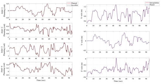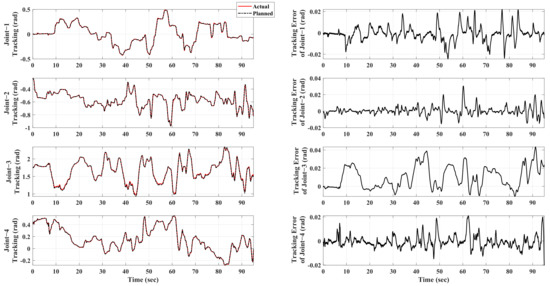The trajectory planning result is shown as Figure 5. For simplicity of expression, in this chapter, is represented as Joint-1, and the others are the same. It can be seen that the trajectory avoids the problems of not smoothened motion trajectory and discontinuous motion velocity caused by manual operation during the experiment and meets the requirements of the ideal trajectory emphasized in the previous controller design part. The planner planning error and final control error are shown together in Table 2. From the data in Table 2, it can be concluded that the planner designed in this paper can obtain planning results that meet the target trajectory requirements of the nonlinear controller with a very small error. The maximum planning error of the joint is 0.03 rad, and the maximum planning error of the three axes is 2.2 cm.