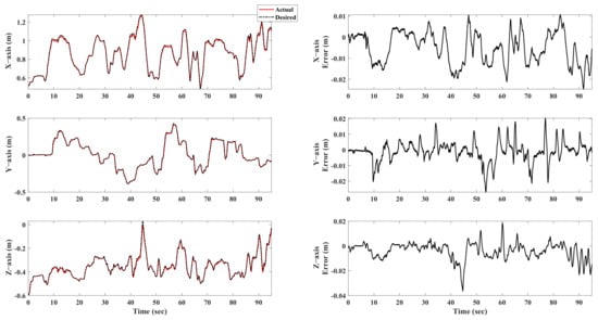 The final control effect of the hydraulic manipulator is shown in Figure 6 and Figure 7. Through the control results, it can be seen that, in the whole process of teleoperation control, the maximum tracking error of each joint of the end hydraulic manipulator is guaranteed to be within 0.04 rad, and the maximum tracking error of the end three-dimensional coordinates is within 2 cm. The results show that the teleoperation framework designed in this paper can guarantee the teleoperation performance of the hydraulic manipulator in the case of master–slave heterogeneity well, that is, it can satisfy the requirements of the hydraulic manipulator teleoperation with the operating accuracy up to 0.02 m under the condition of master–slave heterogeneity.