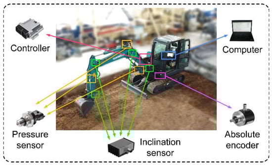 The hardware setting of the system is shown in Figure 1. The autonomous excavator is equipped with four inclination sensors and an absolute encoder to measure the angle of the working device (boom, bucket, and stick) and the swing. Three pairs of pressure sensors are used to monitor the pressure in the hydraulic cylinders (boom, stick and bucket) of the work equipment. Computers are used for processing feedback signals of the controller, monitoring pressure changes of cylinders and generating the optimal excavation trajectory. The controller is used to control the electro-hydraulic proportional valve and transmit the sensor signal to the computer.
