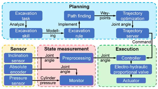 The overall software architecture of our system is shown in Figure 2. The trajectory execution module was run on a controller, while others were run on the computer. Before the excavation, waypoints were generated according to the topological information of the manual excavation trajectory, and then a reference optimal trajectory was generated within machine kinodynamic constraints. During the excavation, the sensor measured the angle of the working device in real time. Then, the state measurement module preprocessed the data in real time and monitored the pressure changes of the working device. Finally, we used a feedback controller to track the optimal trajectory in real time.