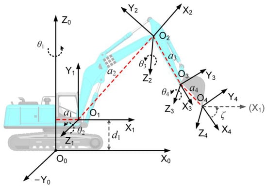 D–H coordinate system of the autonomous excavator. The red dotted line represents the distance from the intersection of Z0 and Z1 axes to the origin of the O1 coordinate system along Z1, and a2–a4 represent the link lengths of boom, stick, and bucket, respectively.