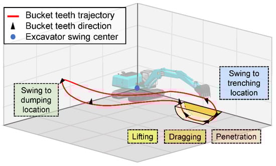 To obtain topological information on the excavation path of the skilled operator and find the waypoints, we established the excavation rules of the skilled operator for the trench task (trapezoidal trench). Figure 4 shows a diagram of the bucket teeth path for the five stages for trenching. For trench excavation, the complete operation process can be divided into five stages: bucket penetration, bucket dragging, bucket lifting, swinging to the dumping location and swinging to the trenching location [].
