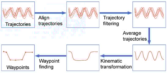 After the trajectories of the skilled operators were generated based on the excavation rules, we analyzed the topological information of the trajectory in the joint space. As shown in Figure 5, firstly, the data was processed with the signal alignment method [] to keep the data length consistent, because operators could not guarantee that the operation state of all tests was completely consistent during the operation. Then, a moving average filter was used to reduce the noise generated by the jerk of the cylinders during excavation. The use of a moving average filter can reduce the interference of noise on the excavator trajectory. Finally, the paths of skilled operators were averaged to obtain a statistically average excavation path [].