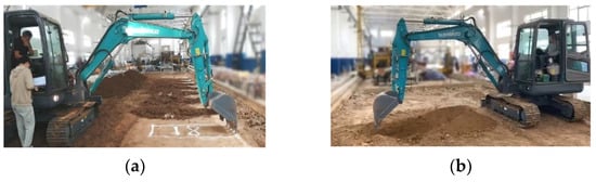 Scene of manual excavation and autonomous excavation. The number in figure represents the engine speed sets at 1800 rpm. (a) Manual excavation; (b) Autonomous excavation.