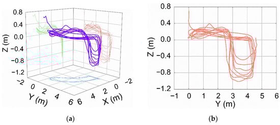 Bucket-tip trajectory in pose space according to our proposed method. Purple, blue, green and red curves are optimal trajectory, XY projection, XZ projection and YZ projection, respectively. (a) Optimal trajectory; (b) YZ projection of optimal trajectory.