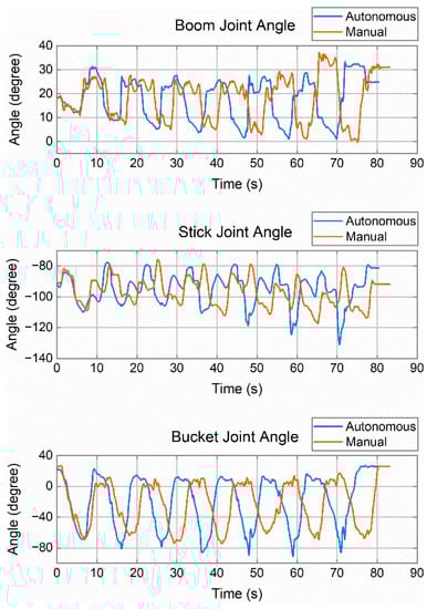 By comparing the autonomous excavation trajectory using the proposed method with the excavation trajectory of a skilled operator, as shown in Figure 8, we see that the method of this paper presents a shorter time while satisfying the dynamic feasibility constraints. In the experiment, the time of autonomous excavation was 80.4 s, while that of the operator was 83.2 s, as listed in Table 3. By using this method proposed, the speed and acceleration during the excavation motion are closer to the dynamic feasibility limit; hence, autonomous excavation tends to move faster. However, it can be seen that the angle fluctuation of each joint in autonomous excavation (comparison of standard deviation in Table 3) is larger when compared with that of manual excavation.