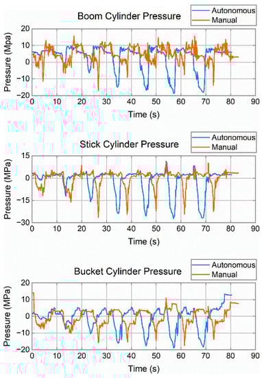 On the other hand, as shown in Figure 9, the maximum absolute pressure of the working device was larger than that of manual excavation, due to the aggressiveness of the excavator being fully used. However, this led to a larger standard deviation of the pressure of the working device for autonomous excavation motion (as shown in Table 4); this is because a large jerk of the cylinder results in unstable motion during the operation, and the stability of the movement is therefore worse than manual operation.