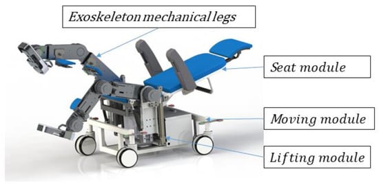 The mechanical structure of Leg-Robot is designed according to the principle of modularity, as shown in Figure 1. Leg-Robot consists of three main modules: (1) the movable chassis module, (2) the weight-reducing support seat module, and (3) the exoskeleton mechanical leg module. Leg-Robot can be adjusted to different sizes and support positions according to individual patient differences. The patients are placed in sitting or lying postures with feet on the pedals of the mechanical leg during the rehabilitation training. The centers of the joints of the lower limbs and the centers of rotation of the robot joints can be aligned automatically. The lower limbs are fixed to the robot through safety straps and aids to prevent secondary injuries caused by overturning during the training process.
