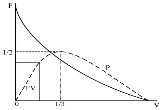 The relationship between muscle contraction force, velocity, and power in Hill’s equation is shown in Figure 3. Muscle power is the product of force and velocity. If force and velocity reach a maximum at the same time during a muscle contraction, the power is maximum, but this is not possible. According to the Hill experiment, the power maximum is 1/6 of the ideal value and is equal to the product of 1/2 of the maximum muscle contraction force and 1/3 of the maximum contraction velocity [14].