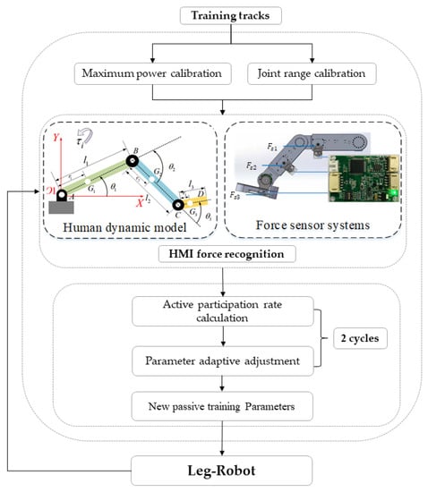 The human–machine interaction control strategy of a rehabilitation robot is a vital factor in the effectiveness of rehabilitation. Through research into the current requirements of people with lower-limb dysfunction and a review of the literature on current research advances in lower limb rehabilitation robots, lower limb rehabilitation robots used in clinical practice generally use a position control strategy, such as classical PID control or sliding mode control [8]. However, purely passive training follows a strictly pre-defined trajectory by the physician, without any form of interaction between the patient and the rehabilitation robot during the entire exercise process [9]. Patients eventually lose their active participation in passive training. The accuracy of passive training parameters is largely limited by the experience of the therapist and cannot be fully adapted to the requirements of individual training parameters. Research findings [10] in movement rehabilitation medicine show that active participation during training has a crucial impact on the recovery of movement learning ability and improvement in rehabilitation because some patients with severe motility impairments can produce muscle activity but no movement or strength.