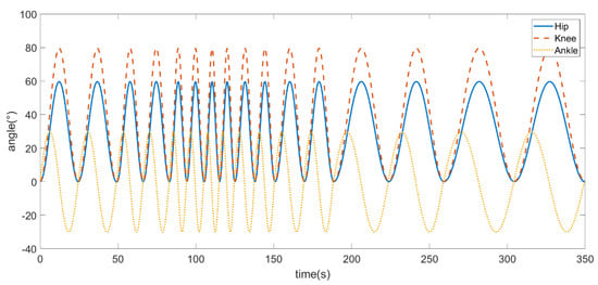 In the course of the experiment, the engagement of the subject during training was calculated for the force of the subject’s interaction with the mechanical leg during training, thus changing the training speed of the joint. The data returned were processed through Matlab to analyze the relationship between the change in joint angle over time and to determine the change in speed during the training process. Considering the coordination of hip, knee, and ankle rehabilitation movements, the active–passive hybrid training mode is only for a single joint. Taking a single leg as an example, when a joint is selected as the main passive mixed training mode, the training cycle of the other joints and the joint movement cycle of the active–passive hybrid training remains the same. In other words, if the hip joint is selected as the main passive joint, the speed of the hip joint is adjusted according to the participation of the hip joint, and the training cycle of the knee and ankle joints is aligned with the training cycle of the hip joint. The hip–knee–ankle angle versus time curve for the hip-active–passive hybrid training mode is shown in Figure 6.