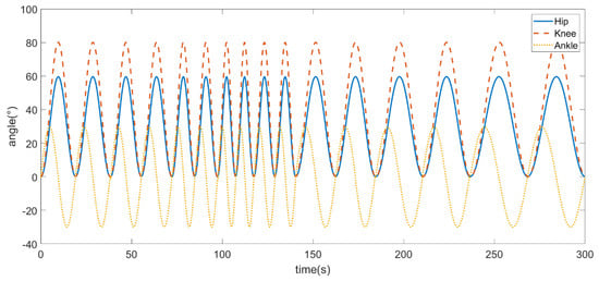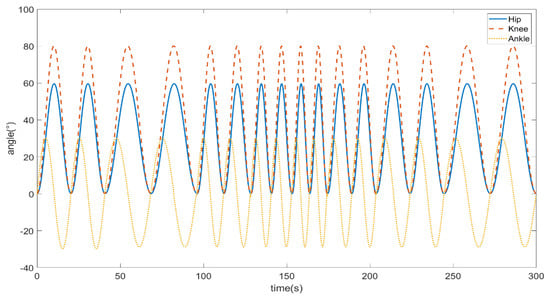 The hip–knee–ankle angle versus time curve during the hybrid active–passive training mode for the ankle joint is shown in Figure 8.