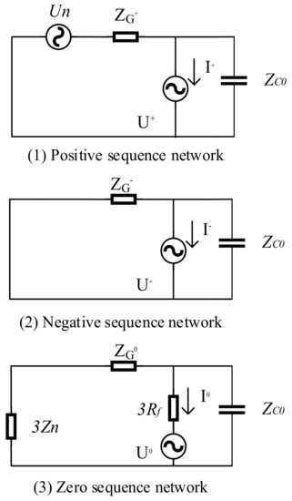 The stator winding of the water turbine generator set has large capacitance to ground. Once a single-phase grounding fault occurs in the stator winding of the unit, the strong fault current will cause great damage to the hydro generator unit. Figure 4 shows the positive sequence, negative sequence, and zero sequence equivalent circuits of hydro generator in the case of single-phase grounding fault of stator winding.
