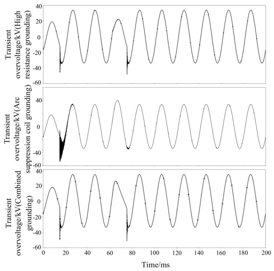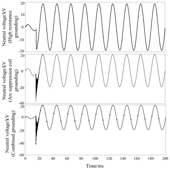 It can be seen from Figure 10 that for the combined neutral grounding mode, the re-arcing significantly increases the transient value of neutral voltage drift, while for arc suppression coil grounding and high-resistance grounding, the neutral point voltage is not higher than that of single arcing. The same method is used for multiple arcing simulation analysis, and the results are shown in Table 3.