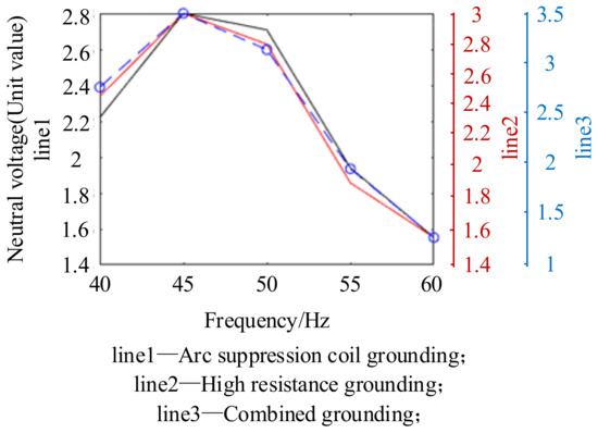 It can be seen from Table 2 that for three different neutral point grounding modes, when the stator winding single-phase grounding fault of hydro generator occurs, the increase or decrease of frequency will reduce the neutral point voltage drift. In order to further analyze the influence of frequency variation on neutral point drift, the simulation calculation of multiple frequency point changes was carried out, and the phase voltage of the generator was set as the reference value. In this way, the relationship curve between the transient unit value of neutral point voltage drift and frequency in case of single-phase grounding fault can be obtained, as shown in Figure 9.