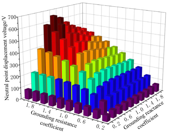 Figure 11 shows the influence of changing grounding parameters on neutral voltage drift under combined grounding mode. In the figure, the grounding resistance coefficient is defined as the ratio of the resistance in the neutral grounding device to the ground capacitive reactance of the stator winding, and the grounding reactance coefficient is the ratio of the reactance in the grounding device to the ground capacitive reactance of the stator winding. It can be seen that keeping the grounding reactance constant and appropriately reducing the grounding resistance coefficient can reduce the neutral point drift. Therefore, when using the combined grounding mode, the parameters of resistance and reactance should be reasonably selected.