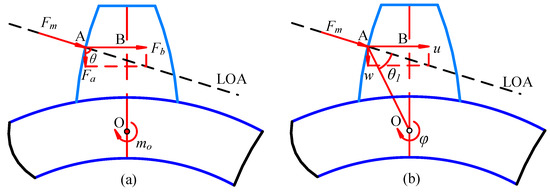 Figure 3 shows a model of the meshing force and deformation of the ring gear segments. Point A is the actual meshing point; Point O is the center of mass of the ring gear segment where the meshing tooth is located; Point B is the intersection of the action line of the radial force Fb and the center line of the gear tooth; and Fm represents the meshing force of the gear pairs [29].