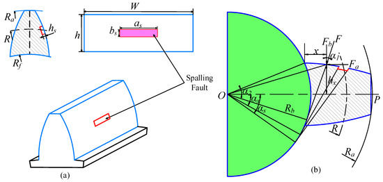 In Figure 4, Ra, Rf and R are the tip circle radius, root circle radius and pitch circle radius, respectively, W and h are the tooth width and total tooth height, is the actual pressure angle, represents the half of the center angle corresponding to a gear tooth, represents the distance between OP and the meshing point and and are the pressure angles corresponding to the edge of the spalling fault area. represents the equivalent concentrated force of the meshing force , and and can be obtained after the meshing force is decomposed.