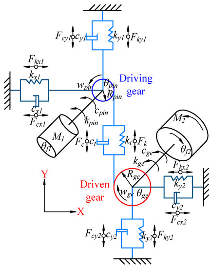 where indicates the mass of driving gear; represents the base circle radius; represents the inertia moment; and indicate the linear displacement of the high-speed gear; and and are the support stiffness and damping.