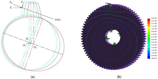 The FEM results for the flexible gear rings are shown in Figure 6b. According to the deformation at different ring gear radius positions, in addition to the complicated deformation of the ring gear near the actual meshing point, the overall shape of the ring gear after deformation presents an elliptical shape. Moreover, the angular error between the long axis of the ellipse and the line of action (LOA) of the meshing force is relatively small.