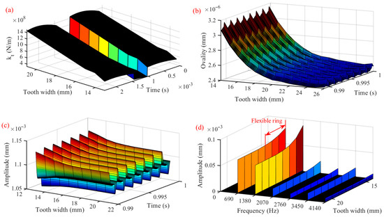 Dynamic response of gear pairs with different flexible gear rim widths: (a) meshing stiffness; (b) ovality of the ring gear after deformation; (c) response of gear pairs; (d) frequency-domain response.