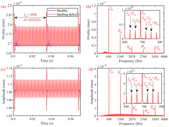 The ovality of the flexible gear rings is shown in Figure 9a. When there are local faults on high-speed gears, the meshing force is impacted, and the sudden change in the flexible deformation of the ring gears is caused, and there is shock on the ovality curve. The time interval between adjacent shocks is 0.0333 s, which corresponds to the input frequency of the driving gears. As shown in Figure 9b, the ovality curve in Figure 9a is converted by the FFT, and then the spectrum of the ovality can be obtained. In addition to the meshing frequency , there are also harmonic frequencies generated by modulation, such as . The time-domain response and frequency-domain response of the gear pairs are shown in Figure 9c,d. Similarly, when there are localized spalling faults on the high-speed gears, there is periodic shock on the time-domain response of the ring gears in the y direction, and its spectrum composition is similar to that of the ovality.
