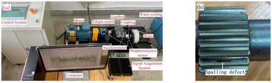 The gearbox test bench in Figure 10a is used for obtaining the response of the gear pairs. The high-speed gear with localized spalling faults is given in Figure 10b. The fault length is 6 mm, the width is 2 mm and the depth is 0.2 mm. The braking torque is 10 N·m, and the input speed is controlled at 1800 rpm. The tooth width of the gear pairs is 25 mm, and other components used in experiments are consistent with those set by the system equations.