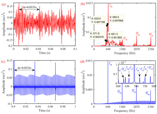 The acceleration response of the gear pairs obtained from the mathematical model is provided in Figure 11c,d. The result is similar to the experimentally measured signal, which verifies the mathematical model established in this paper.