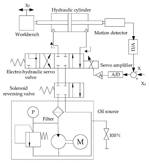 As shown in Figure 1, a typical electro-hydraulic servo system includes a workbench, hydraulic cylinder, displacement sensor, electro-hydraulic servo valve, servo amplifier, electromagnetic reversing valve, filter, and an oil source. The worktable in the figure is used to carry external loads and is connected to the piston of the hydraulic cylinder. The displacement of the cylinder is controlled using an electro-hydraulic servo valve. The desired control effect is that the position of the control object can be accurately changed according to the control requirements. During position feedback, the feedback position signal is collected, and the A/D is converted through a displacement sensor data acquisition (A/D) card. The converted signal is compared with a predetermined signal value, thereby generating an error signal. Using the error signal to adjust the input of the system, an overall closed-loop position control is formed [34].