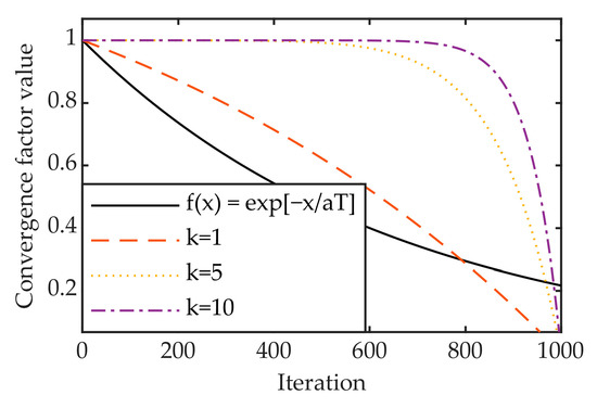 where is the current iteration number, is the initial value of the convergence factor, and is a controlling factor, which can control the amplitude of attenuation, . The original convergence function and control factor take , and the nonlinear convergence factor comparison of and is shown in Figure 3.