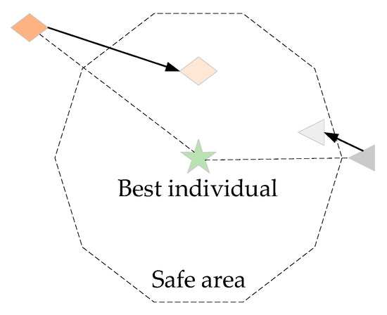 From the analysis of Equation (19) and the penalty mechanism for leaving the safe area shown in Figure 5, it is observed that when the individual sparrow leaves the safe area to a greater extent, the pull-back is closer to . The smaller the escape safe area is, the closer it is to when pulled back.