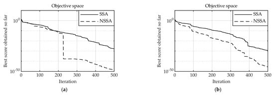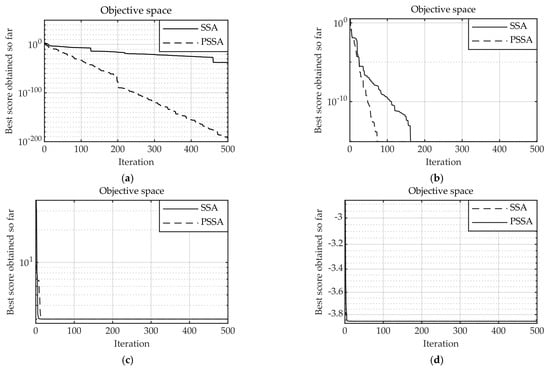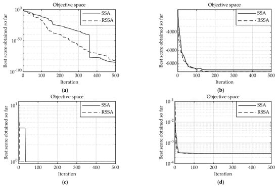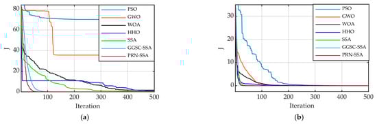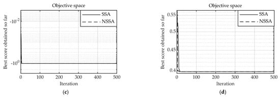 As shown in Figure 10, for the unimodal and multimodal functions, the PRN-SSA can still find the optimal value at 500 dimensions. For the 500-dimensional complex multimodal function , the PRN-SSA can still jump out of the local optimal value and converge to the optimal value of −41,898.33333. The convergence curve shows that for high-dimensional functions, the PRN-SSA also has significant advantages.