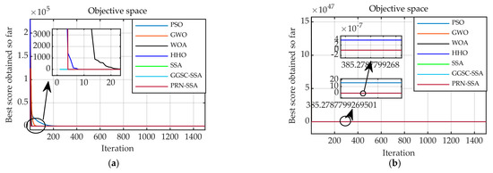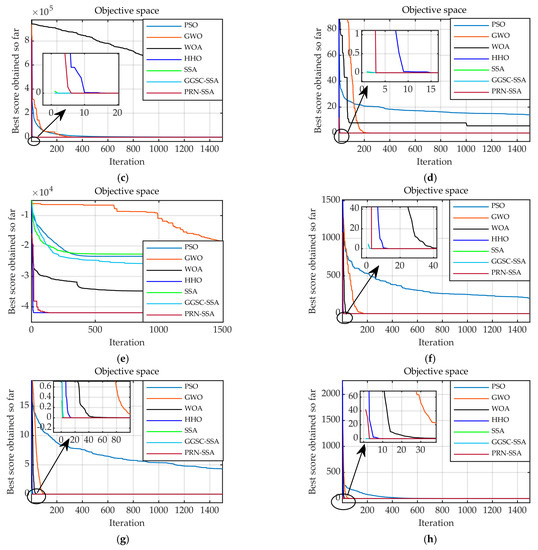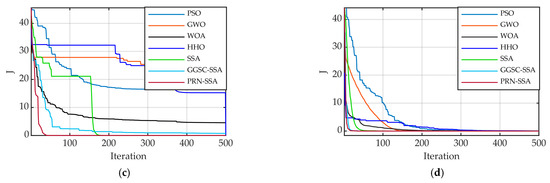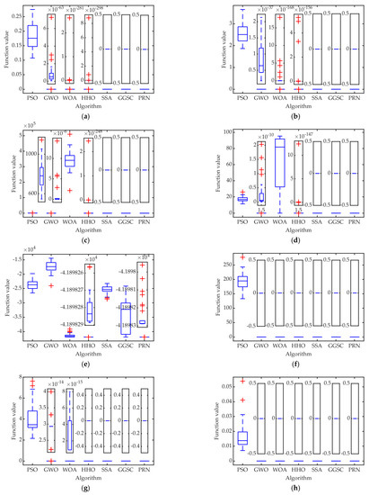 Table 4, Table 5 and Table 6 show the simulation results of the seven optimization algorithms on the 23 benchmark functions. The unimodal test function can test the convergence speed and local development ability of the algorithm and is suitable for evaluating the utilization of the algorithm. In terms of mean and standard deviation, except that the effect of functions 5 and 6 is worse than that of SSA and GGSC-SSA; for other functions, the results of PRN-SSA are better than those of various intelligent algorithms, among which can find the theoretical optimal value. It is worth mentioning that for and , although PRN-SSA lags behind similar algorithms, it is still significantly better than the classical algorithms. Overall, among the unimodal test functions, the PRN-SSA is the best performing algorithm in terms of optimization ability and stability. Compared with the other six meta-heuristic algorithms, it is very effective and competitive, and the test results show that the PRN-SSA still has a good development ability.