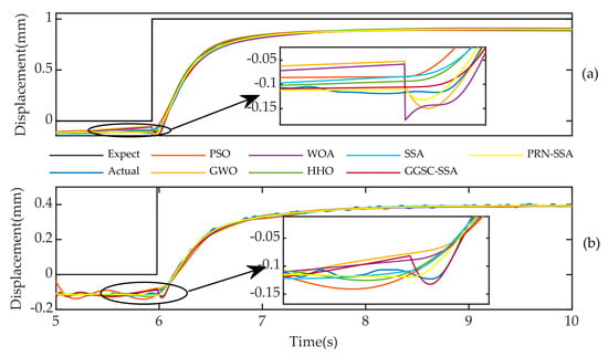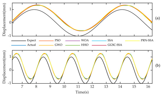 Data collection was performed on the test bench, and the sampling time was 0.001 s. Data obtained from the last sampling were subjected to data preprocessing to eliminate trend items. The preprocessed data are zero-averaged, the corresponding DC component is removed simultaneously, and the required data are obtained and stored. Based on this, two sets of comparative experiments are set up in this section: (1) using the sinusoidal signal as the input signal and (2) the sampling step signal as the input signal. The basic settings of all algorithms are as follows: the population size is 80, the dimension is 30, the maximum number of iterations is 500, and the range of each dimension is (0, 1013). The comparative test of system identification is repeated 20 times, and the result is the average of the results of the 20 runs. The electro-hydraulic servo system does not add control compensation, and the system is unstable at the beginning; therefore, the sine input is selected after 2π s, and the experimental time is set to 10 s. The step input selects the graph after 5 s, and the experimental time is set to 5 s.