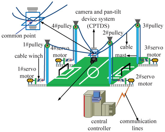 The cable-driven parallel camera robot (camera robot for short, see Figure 1) is a type of CDPM (cable-driven parallel manipulator) consisting of four computer-driven servo motors that enable the controlled release of four cables that act in parallel on an end-effector, i.e., the CPTDS (camera and pan–tilt device system). The camera robot can take pictures and videos with an aerial view that conventional cameras would have difficulty in realizing [1], making it the best candidate for aerial panoramic photographing in big venues, such as stadiums, football fields, theaters, etc.