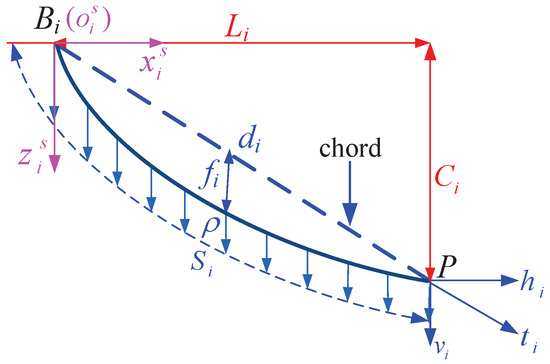 is the tension in the cable i at the end point P, is the horizontal component of , and is the vertical component of . is the horizontal length of the span of cable i, and is the vertical length of the span of cable i. is linear density of the inextensible cable, and is the mass of the CPTDS. is the length of the cable i, and is the sag of cable i at the center of the horizontal span. The catenary equation can be written as follows [42]: