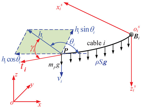 As illustrated in Figure 4, the cable tension of the cable i is along the tangential direction of the catenary at the cable end node P. As a consequence, can be decomposed into the components that are along the directions of the x, y and z axes, respectively, which can be written in terms of , where is the horizontal component of as described in Equation (1) and is the angle between and . The inertia is a vector. is the external force on the CPTDS. The tangent at P can be computed as the following equation: