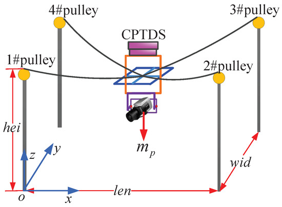 As shown in Figure 1, the four cables intersect at a common point, and therefore the cables are only responsible for translation. The camera is mounted on a pan–tilt device, which resembles a composite hinge structure. By means of the pan–tilt device, the camera realizes pan (yawing) and tilt (pitching) motion. As a result, the CPTDS can be looked as an ideal mass point P with three translational DOFs, at which the four cables meet. Thus, the position vector of the point P is expressed in the global fixed frame , and it also denotes the end point of the cable. The camera robot can be categorized to completely restrained positioning mechanisms (CRPMs) [41]—namely, the number of the cables m is equal to DOF of the CPTDS n plus one ().