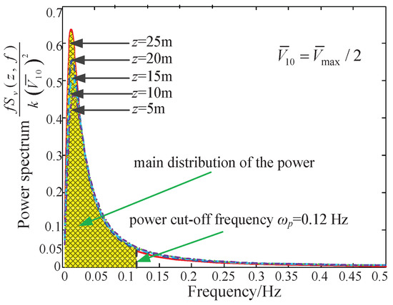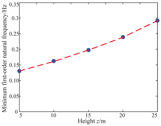 Figure 19 shows the minimum value of the first-order natural frequency on the different horizontal sections of the workspace with different heights, which are significantly improved compared with those shown in Figure 10. The minimum first-order natural frequency on each horizontal section all exceeds 0.12 Hz. At z = 5 m, the minimum first-order natural frequency is equal to 0.13 Hz. Although it has been improved, it is still close to the energy truncation frequency = 0.12 Hz. Therefore, it is still vulnerable to wind disturbance. Thus, some measures are essential to enhance the first-order natural frequency of the camera robot, such as the stiffness improvement and tension regulation.