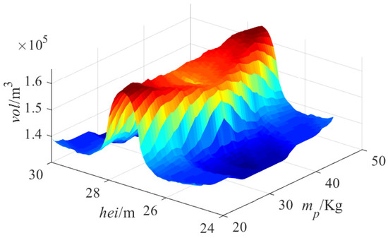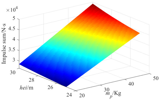 Figure 22 and Table 8 show the relationship of the impulse sum on the CPTDS along the sampling locus with the pulley point height and the mass of CPTDS when the optimization variables and are fixed. In this case, and . There is a positive correlation of the impulse sum with the pulley point height and the mass of CPTDS . The higher the pulley point height and the greater the mass of the CPTDS are, the greater the impulse sum will be. In addition, it can be observed from Table 8 that the impulse sum linearly increases with increasing of the pulley point height and the mass of the CPTDS.